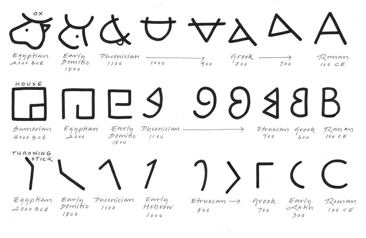 Our alphabet evolved out of these drawings—of an ox, a fish, a hand, a hook, a house, a cave. These forms were passed along, the original images becoming simplified in the handling. By 1200 BCE, an alphabet of 22 letters emerged with the Phoenician traders and evolved over time into the Roman letters. This syllabic system was efficient for commerce. It also remained a magical portal linking the inner voice with the outer world, bringing thoughts into form through the movement of the hand and stylus on the page.